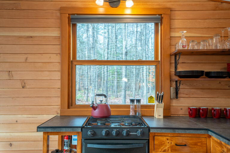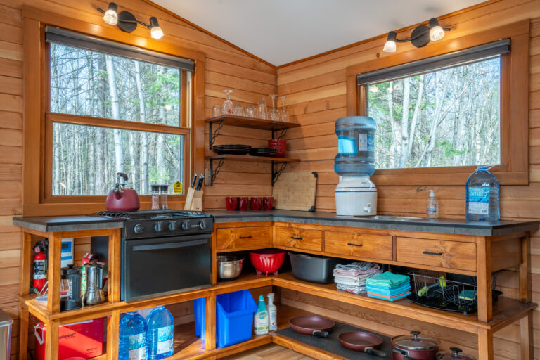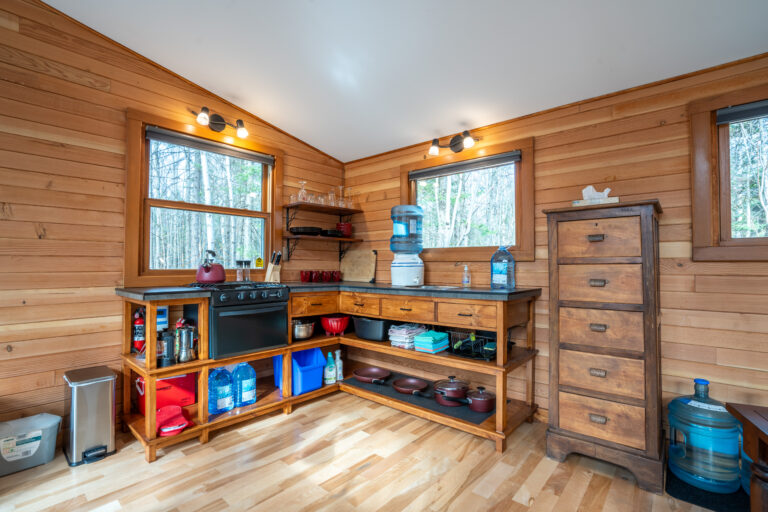 Les toilettes à compost et les douches sont situées au bloc sanitaire à 30 secondes de marche du chalet. Puisqu’il n’y a pas d’eau courante dans le chalet, nous fournissons l’eau potable et de l’eau non-potable en bouteille de 18 litres pour la vaisselle et vos autres besoins. Il y a trois brûleurs au propane et un coin cuisine bien équipée qui vous permettront de préparer vos repas en toute simplicité. Vous aurez accès à une glacière très performante qui conserve les blocs de glace jusqu’à six jours (la glace est fournie). Un panneau solaire et une batterie haute performance fournissent le courant 12 volts pour l’éclairage et pour brancher votre téléphone.